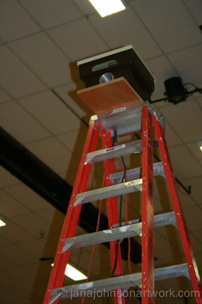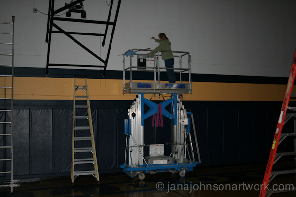 We started last Saturday morning, arriving at the school all ready to go to work, only to discover the scaffolding, ladder, and tables we’d requested hadn’t been delivered yet. It was a gorgeous spring day, and with rain in the forecast, I thought it was a sign (no pun intended) we were to take the day off and go play! After a few phone calls, and a lengthy lunch break, we returned to the school with everything we needed to begin. First off, Brad clamped a board to the very top of a giant ladder upon which he placed his opaque projector.