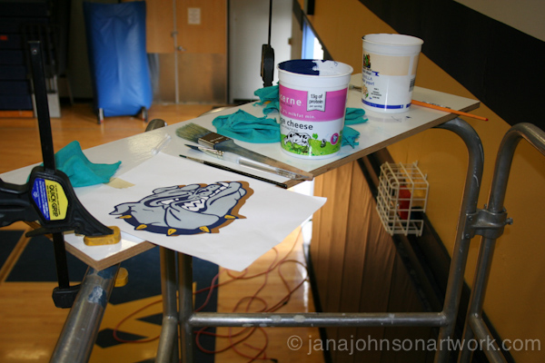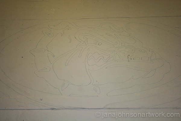 I was jealous of the tape Brad was using to help outline his letters. As a pastel artist, I don’t have to be that precise with my outlines or edges. Painting the bulldog was all about smooth edges, precision and following the drawn lines but also checking to make sure this giant image was correct to the original design.
