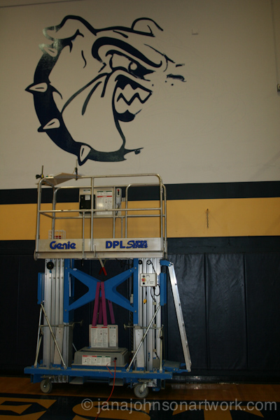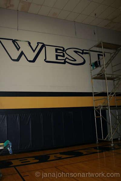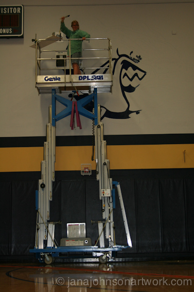 This week in Oregon it’s Spring Break, when all students elementary through college are away from school on vacation. Just because we like to be different, Brad and I spent the week at school – West Albany High School. Brad was hired to paint the school logo and name on the two end walls and I volunteered to help. It wasn’t the first time we’ve worked together on a sign project, but I believe it was the largest, and like always, it was an interesting challenge!