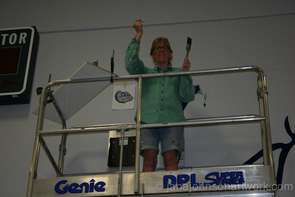 Here I’m drawing on the artwork from Brad’s designs he printed from his computer which are being projected onto the wall. We had to shut off all the lights we could to get the image to show up, but there was still a lot of light which made viewing the image somewhat difficult. We drew in sections, and after finishing an area, we’d climb down, shift the scaffolding, lift, ladder and projector, adjust the tape measure Brad was using to keep the ladder placed at the same length from the wall, then climb back up and continue drawing. I can’t tell you how many times we stepped or tripped on that tape measure…