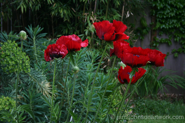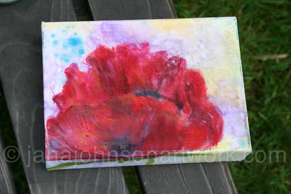 These are works-in-progress. The first poppy painting is 4×12 inches, and this poppy is 7×5 inches. I’ve since started and maybe finished two 12×12 inch canvases and a 14×17 inch canvas. More photos to come!