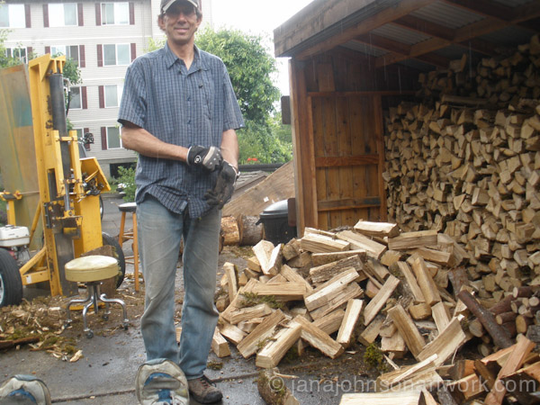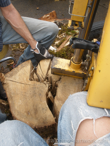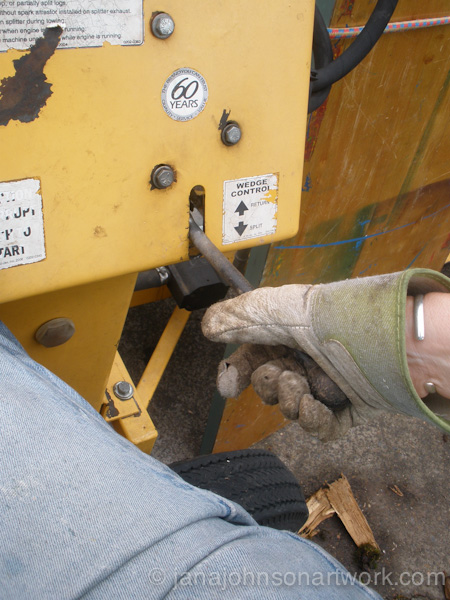 We’re a good team – while Brad wrestles the logs into place, I run the splitter. We both wear headphones with music to cover the noise, so we use hand signals to show when Brad’s ready for me to lower the wedge. I don’t want to lop off his thumbs…!