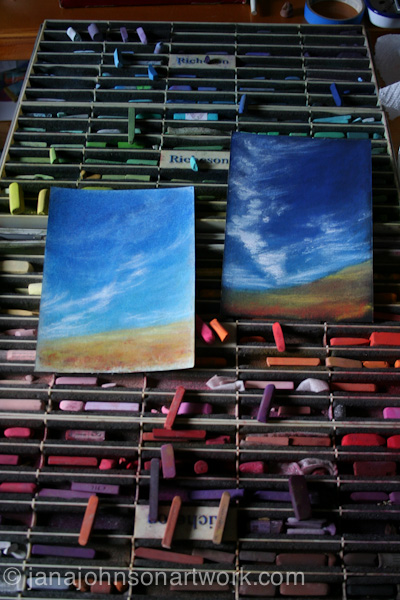 Today in the studio I’m painting small landscapes on sanded paper. They’re both on black sanded paper, but one has been painted ahead of time with white gesso. They’re maybe half finished at this point.