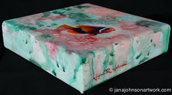 Well, after a week of playing with some loose acrylic paintingson paper, I returned to fish. This one is painted on canvas and has a watercolor background with an acrylic painted clownfish. Earlier this month, I went to a great local pet shop – Animal House – and received permission from the owner to take photos of some of the critters there.