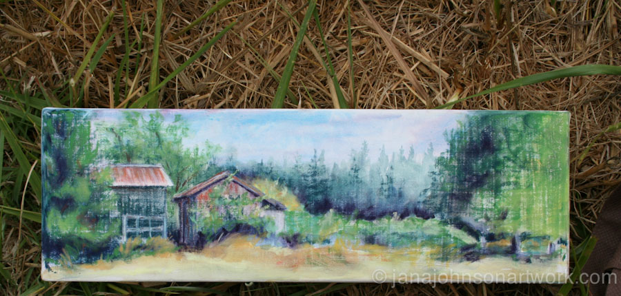 Can an artist succeed painting multiple subjects? I sure hope so, considering how I love to jump around and paint so many different genres. Animals, flowers, people, still life, and today a landscape. In August of 2013 our local plein air group painted at a lovely farm west of Eugene Oregon. After wandering around, absorbing all the beauty, this was what I finally settled down to paint—an overgrown shed. I chose it partly because it was just behind where I’d parked, and I could open the back of my car and work right there, but I was also attracted to the rusty shed roofs.