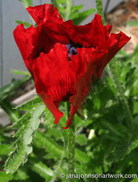 In our backyard I have an amazing red poppy plant that blooms every May. It is my favorite flower because of the rich red blooms which can’t be captured by photography. This year the first poppy popped open on Mother’s Day, and after a fabulous luncheon feast put on by my oldest daughter and her friend, I returned home and immediately started painting since it’s the only way I can capture the deep, varied reds of these flowers. Every May I try to paint these poppies daily until they’re through blooming. I painted in watercolor on Yupo paper, instead of using pastels over watercolor like I’ve used in past years.