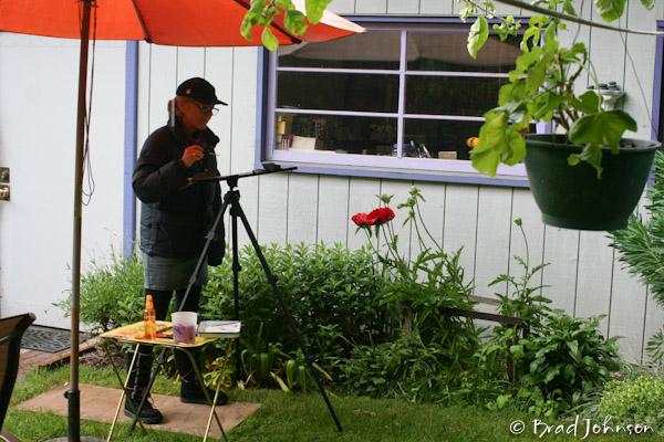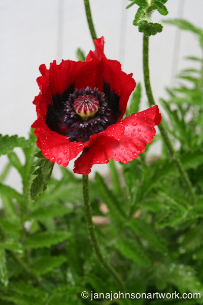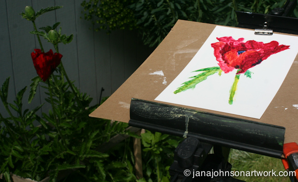 The next day we were out of town, helping my in-laws pack since they’re moving this week, but today I was ready to go to work and paint more poppies. Instead of the nice sunshine we enjoyed over the weekend, today was rainy, not just showers, but solid rain, all day long. That didn’t stop me, since I know the poppies are only out for a short while, so I set up under our picnic table umbrella, put on my down jacket, scarf, wool hat and went to work!