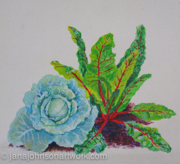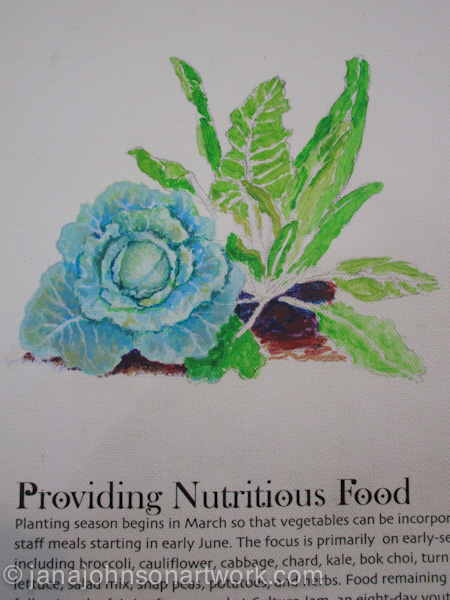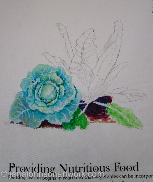 During the process of working out what needed to be painted on the Stewardship and Sustainability banner for the Oregon Country Fair, a new banner was introduced into the equation. The Garden Crew was tagged to be celebrated this year, so a banner was created and printed with the hopes I’d be able to paint another different garden scene upon it before the fair. Once the banner was delivered to the sign barn, and grommets had been installed, it was time to work out a new drawing, transfer it and start painting.