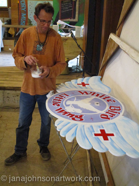 While he worked on that, I took a break to photograph some other painting going on in the barn. Brad (a fabulous Corvallis sign artist) was working on the White Bird sign, having finished the new Info sign earlier. These signs needed to follow a previous format – especially the Info sign, so they’d be recognizable throughout the fair.