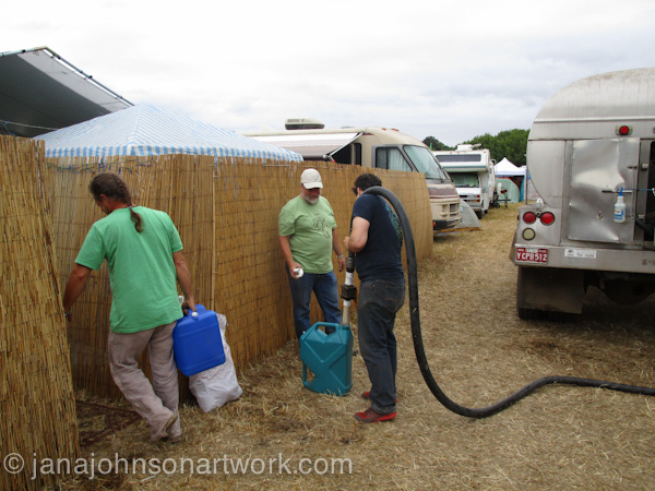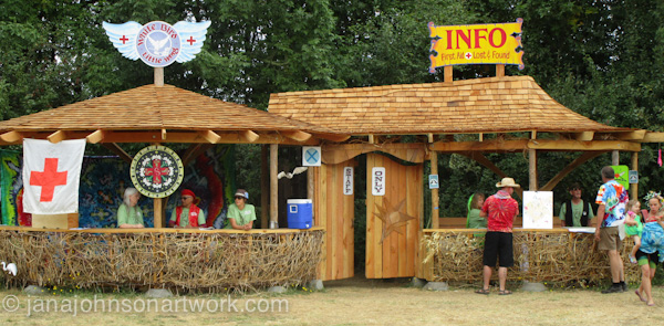 The Oregon Country Fair has thousands of volunteers that work behind the scenes to make the fair the terrific festival it’s become after 46 years in existence. As sign painting volunteers, we’ve teamed up with friends that work security, have booths, or participate in other ways which gives them passes to camp on the fair property a few days before and during the fair. Some people camp behind their booths in the main fair area while others camp in the trees around the sign barn, or in other designated areas which have evolved and developed through the years. We camp in what’s known as Miss Piggy’s Lot which is a recently mowed giant hay field. We were fortunate to be invited to join an established camp a few years ago and the field is sectioned off into camp spots with fire roads, and access to water and “blue box” porta-pots in each area. This year we had 14 people in our “compound” – 3 vehicles, 8 tents, a kitchen area and living room. In Miss Piggy’s alone there are probably another 100 “compounds” similar to ours. When we set up camp, we pound in metal stakes around our perimeter, then hang clothesline and tapestries along those lines with bamboo and reed fencing along the front, including a nice entrance hallway. It truly does feel like home once it’s finished.